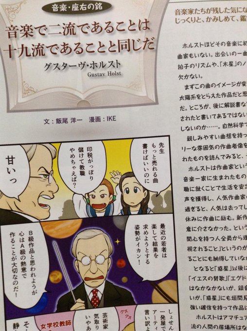 第2回 グスターヴ・ホルスト Published 2016年11月2日 at 393 × 591 in ILLUST ← 前へ 次へ → 「音楽で2流であることは19流であることと同じだ」 【お仕事情報】いずみホール@Izumi_Hall 音楽情報誌「Jupiter」連載中の「音楽・座右の銘 第二回」はホルスト!音楽ライター・飯尾洋一さん@iio_yの深い考察のテキストを元に楽しく(ふざけて)描かせていただきました! pic.twitter.com/faTfi4qhiw posted at 20:36:10