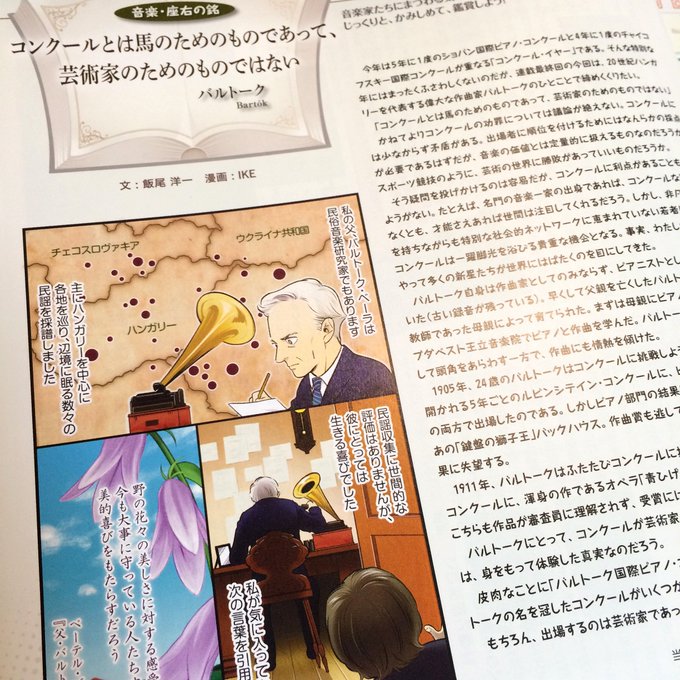 第6回 バルトーク Published 2016年11月2日 at 393 × 591 in ILLUST ← 前へ 次へ → 「コンクールとは馬のためのものであって、芸術家のためのものではない」 【お仕事②】いずみホール情報誌『Jupiter』連載中の「音楽・座右の銘」最終回はバルトーク。芸術家とは何か?飯尾さんの巧妙な文章と共にお読み下さい。サイトでもPDFが公開されてます!→www.izumihall.jp/pdf/zayuu6.pdf pic.twitter.com/OBqIu4vQi6 posted at 21:01:27
